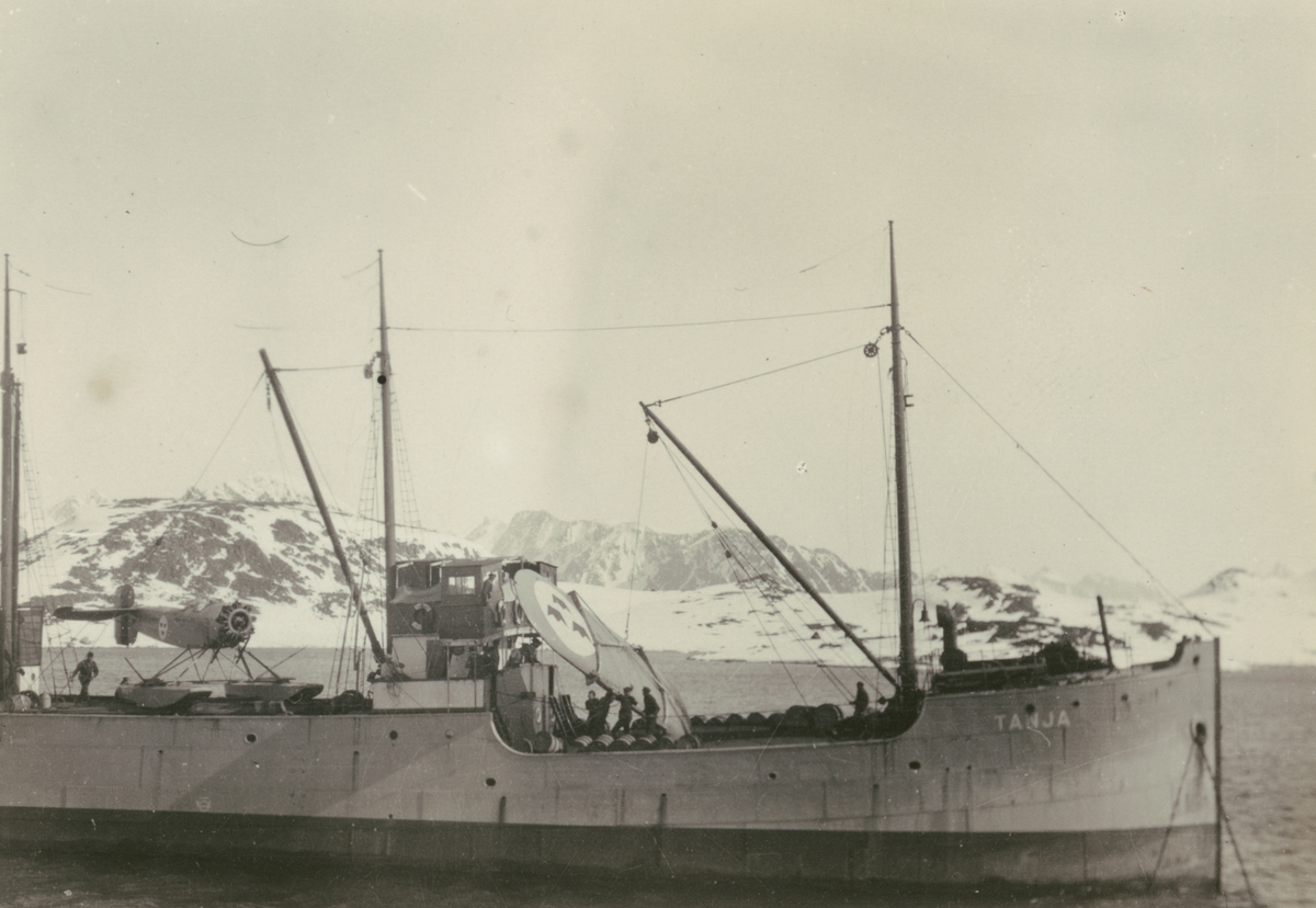 Fotografi från svenska undsättningsexpeditionen 1928. Motiv av fartyget "Tanja" i havet med snötäckta berg i bakgrunden.