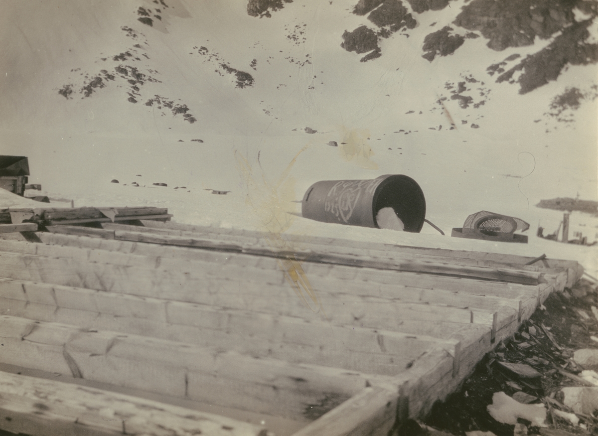 Fotografi från svenska undsättningsexpeditionen 1928. Motiv av husgrund och tunna nedanför snötäckt berg i Virgo Bay.
