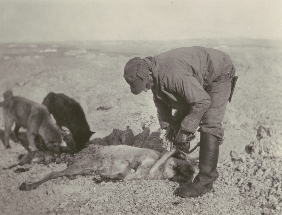 Fotografi från Ahlmannexpeditionen 1931. Motiv av man och två hundar vid dödad ren.