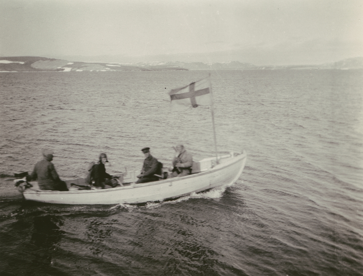 Fotografi från Ahlmannexpeditionen 1931. Motiv av fyra män i liten båt på hav.