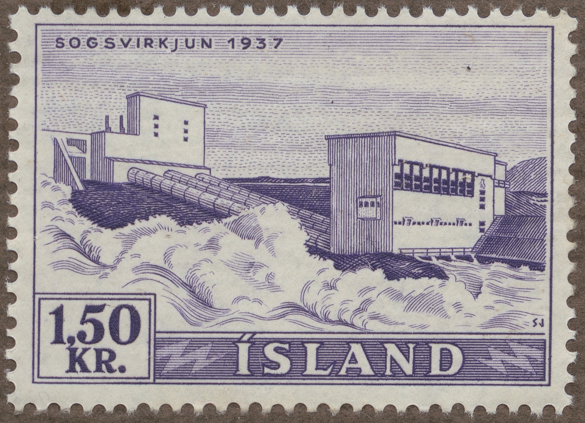 Frimärke ur Gösta Bodmans filatelistiska motivsamling, påbörjad 1950. Frimärke från Island, 1955. Motiv av Sogsvirkjun "El-kraftverket 1937"