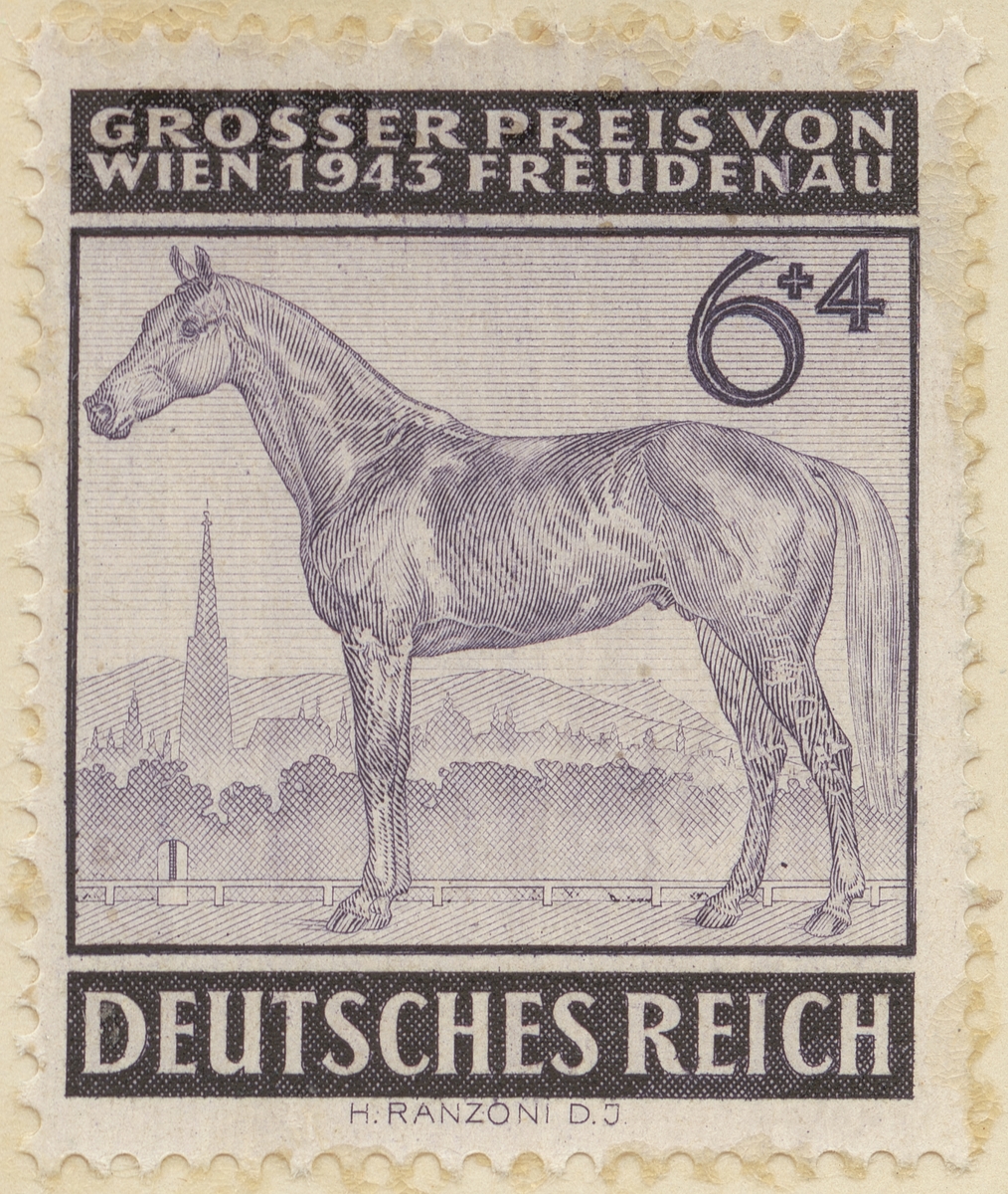 Frimärke ur Gösta Bodmans filatelistiska motivsamling, påbörjad 1950. Frimärke från Tyskland, 1943. Motiv av Pris- Häst i Wien