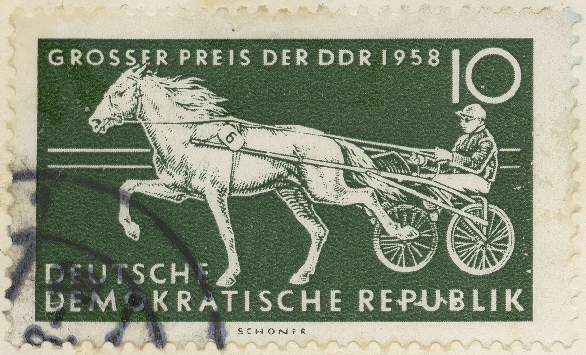 Frimärke ur Gösta Bodmans filatelistiska motivsamling, påbörjad 1950. Frimärke från Öst Tyskland, 1958. Motiv av Kappkörning
