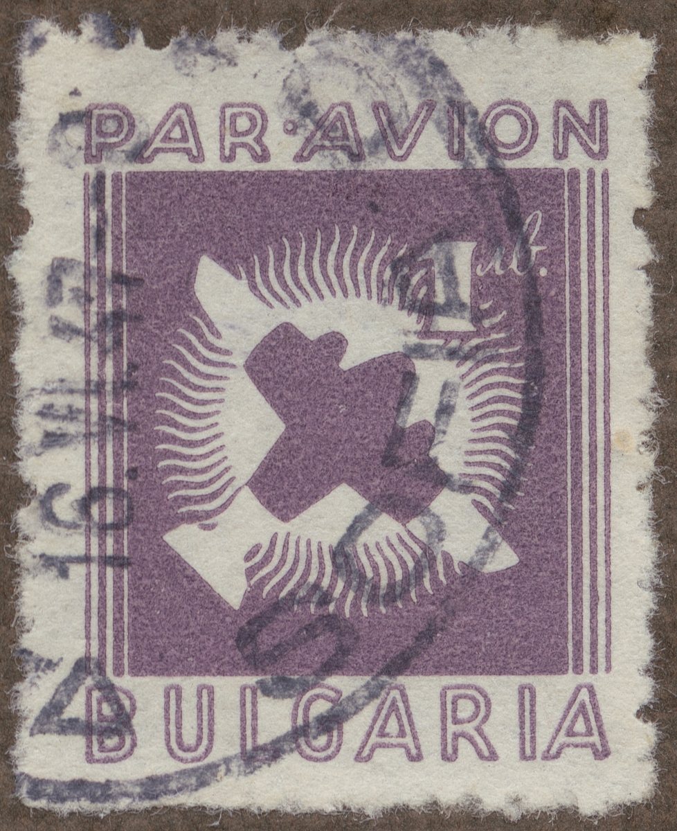 Frimärke från Bulgarien, 1946. Motiv av Stiliserat flygplan mot solen