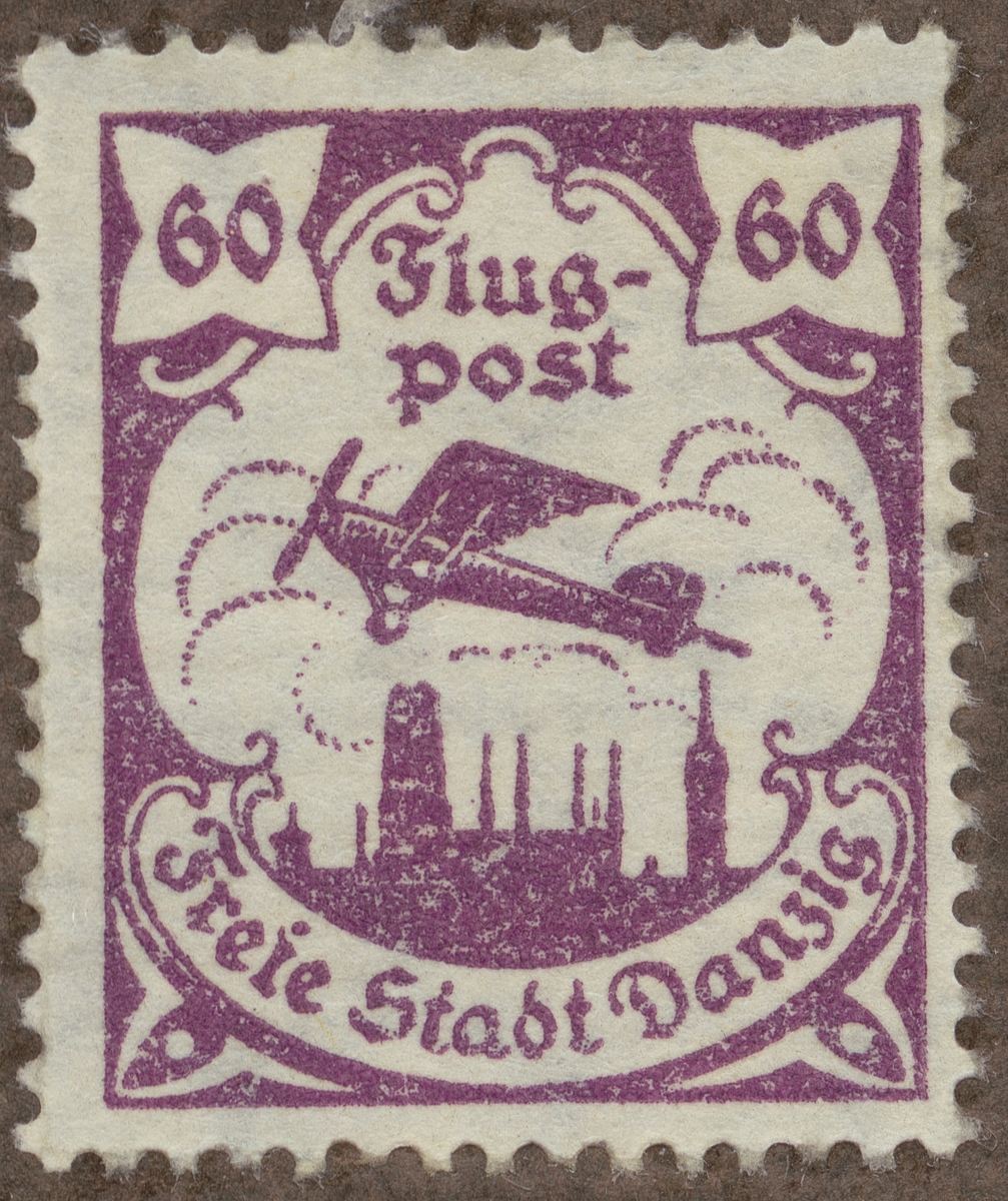 Frimärke från Danzig, 1921. Motiv av Monoplan över Danzig