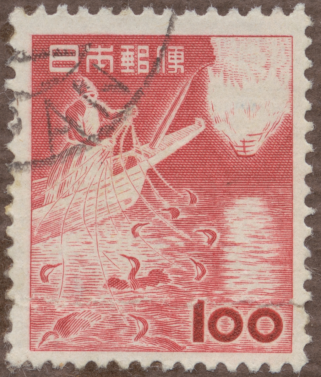 Frimärke från Japan, 1953. Motiv av Fiskebåt med bloss -vadarfågel eller Kormoran fångst-