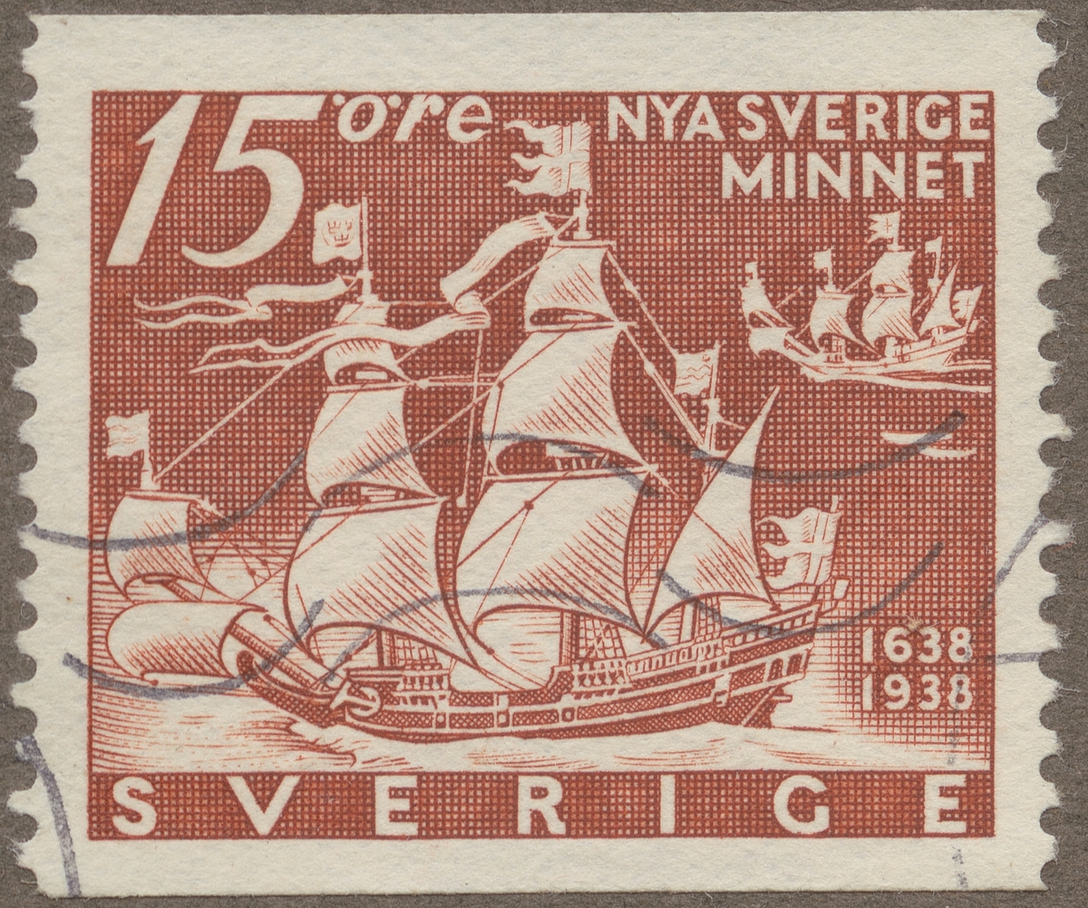 Frimärke från Sverige, 1938. Motiv av Två fartyg som förde svenska emigranter till Delaware 1638. I förgrunden skeppet "Calmar Nyckel", byggt i Holland och köpt av ett sjöfartskompani i Kalmar. Till höger därom skeppet Fågel Grip. -Till svenska kolonien Delawares 300-årsjubileum: 1638-1938.