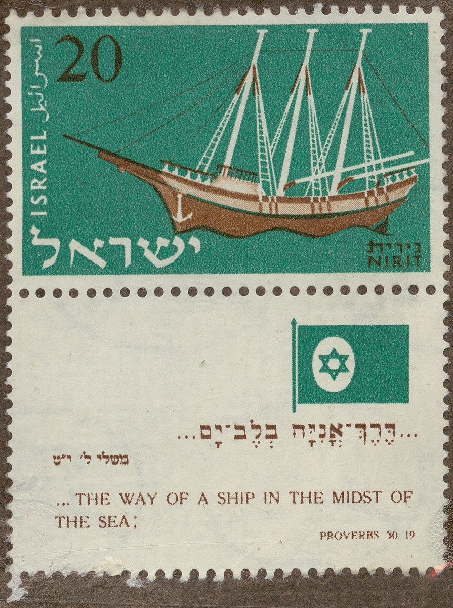 Frimärke från Israel, 1958. Motiv av Tremastat slättoppare Ordspråksboken: 30:19: ..."Skeppets väg mitt i havet"... "Serie: Israels handelsflotta."