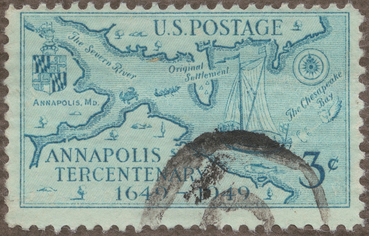 Frimärke från U.S.A., 1949. Motiv av Liten seglare i Chesapeakeviken från mitten av 1600-talet -Gammal karta från samma epok- överst t.v.: kolonien Marylands vapen. 300-årsminne av staden Annapolis:s grundläggning: 1649-1949.