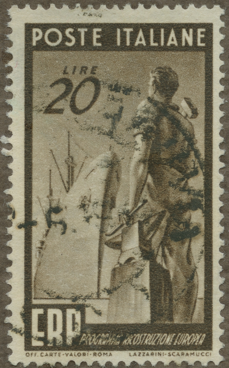 Frimärke från Italien, 1949. Motiv av Italienskt ångfartygs stapelavlöpning