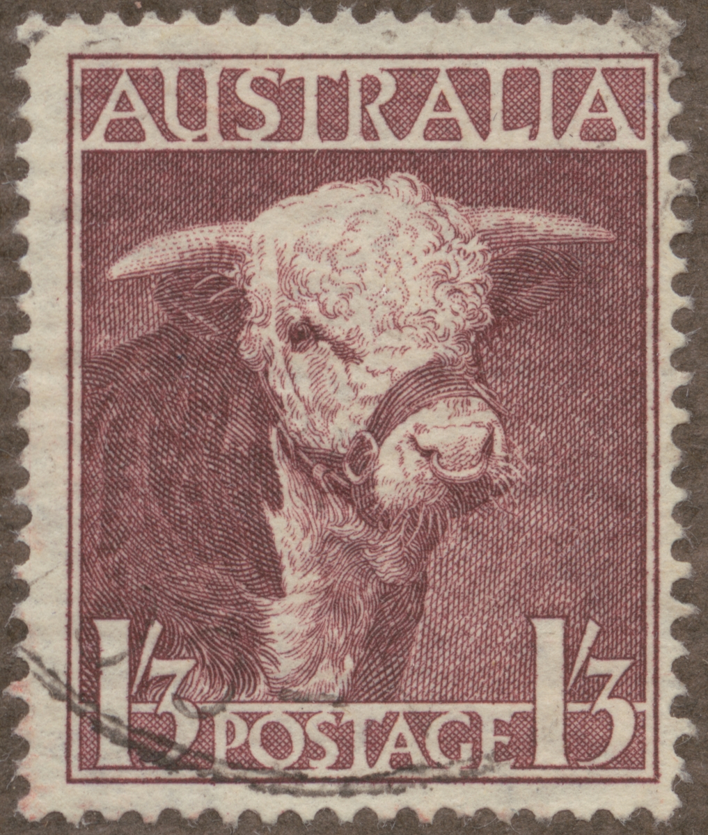 Frimärke från Australien, 1948. Motiv av Tjur av Hereford ras