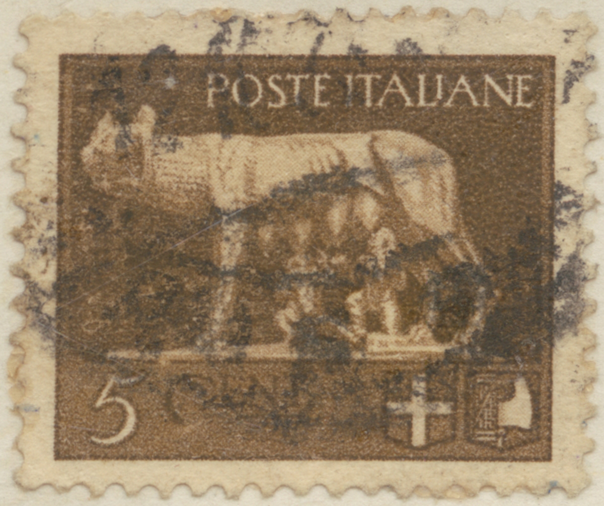 Frimärke från Italien, 1929. Motiv av Varginnan med Romulus och Remus