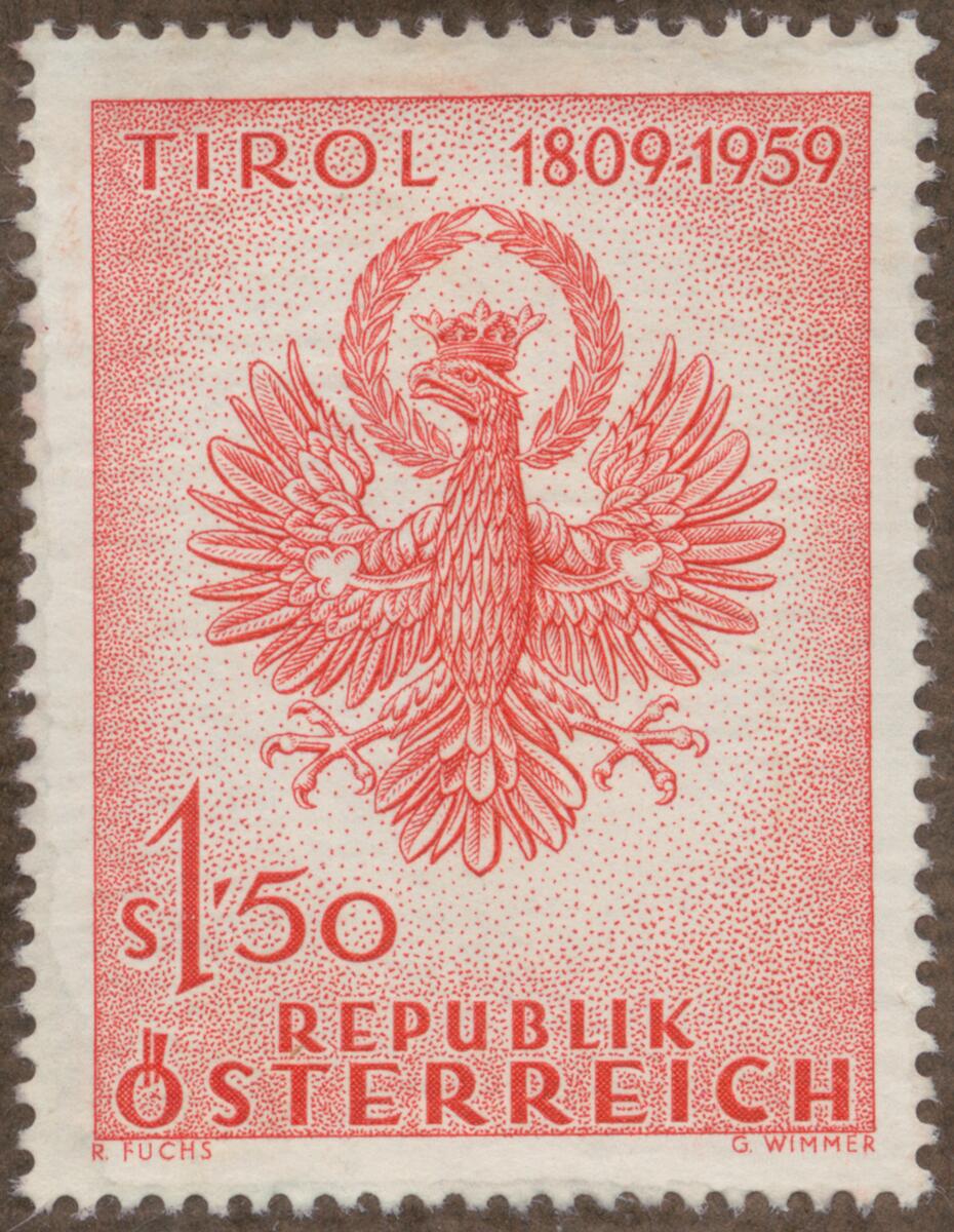 Frimärke från Republiken Österrike, 1959. Motiv av Tyrolens Vapen: 1809-1959. -150-årsminne: Tyrolens kamp för frigörelse.
