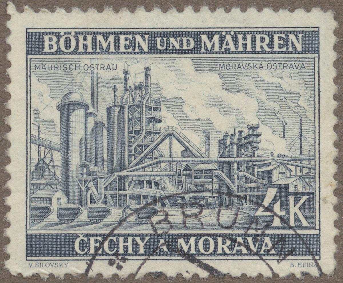 Frimärke från Böhmen-Mähren, 1939. Motiv av Järnverksanläggning i Ostrau (Ostrava), Böhmen-Mähren 1939.