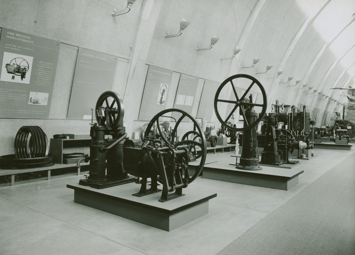 Tekniska museet, ca 1939. Del av utställning i maskinhallen, varmluftmaskin och ångmaskiner.