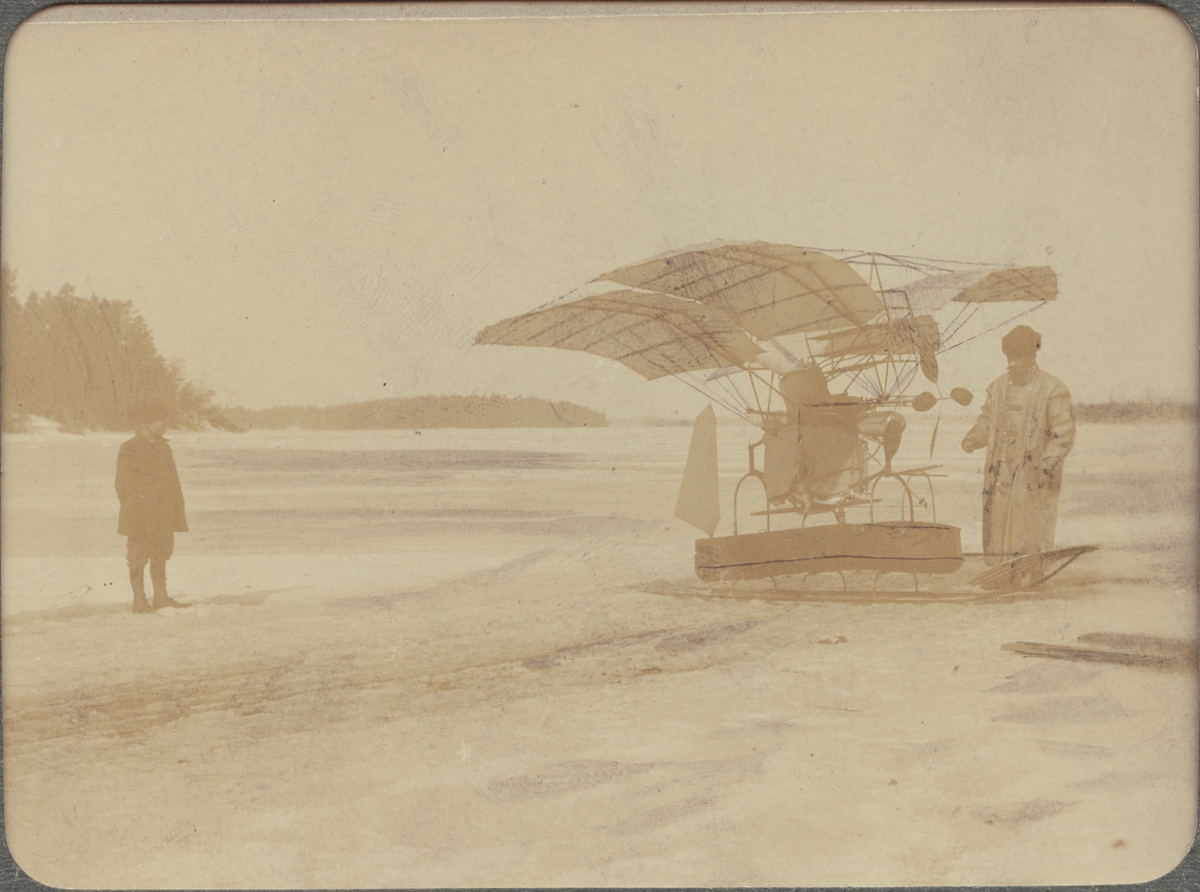 C.R. Nyberg vid sin ångdrivna flygmaskin "Flugan", här försedd med medar för experiment på snö.