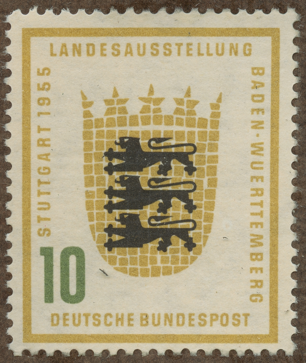 Frimärke från Västtyskland, 1955. Motiv av Baden-Würtemberg Utställning i Stuttgart 1955