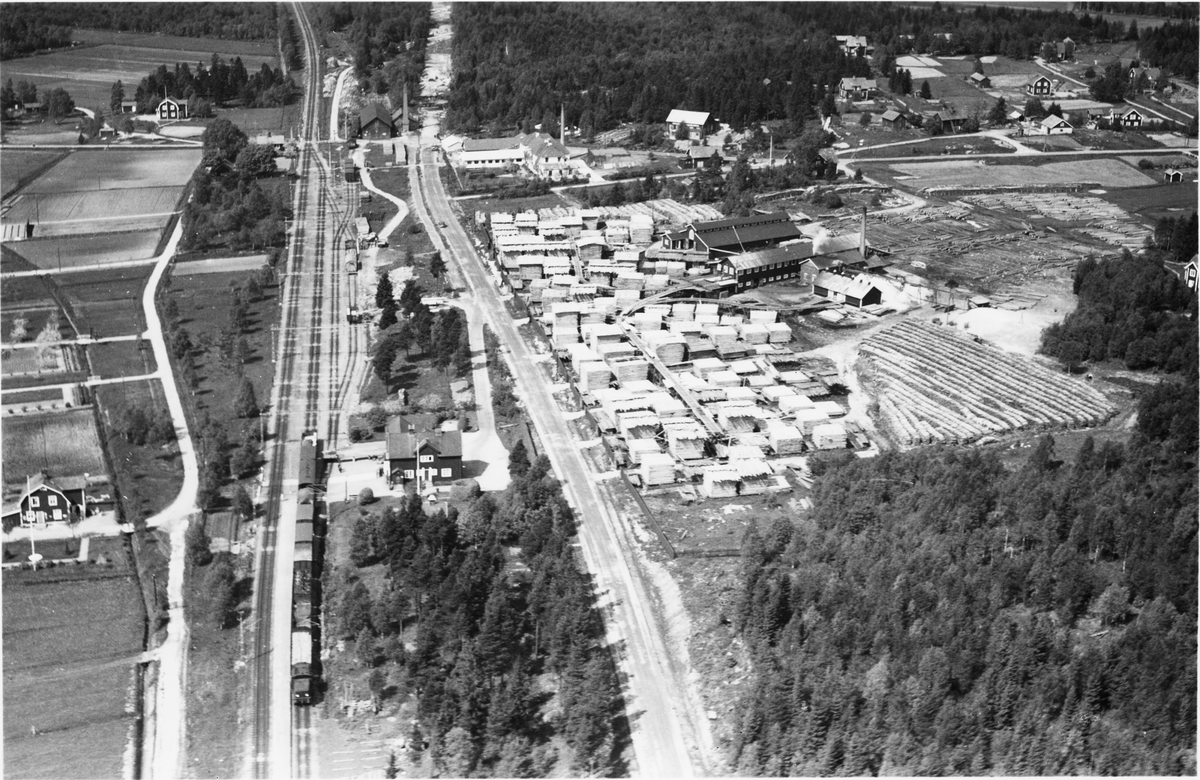 Flygfotografi över Järlåsa sågverk i Uppland.