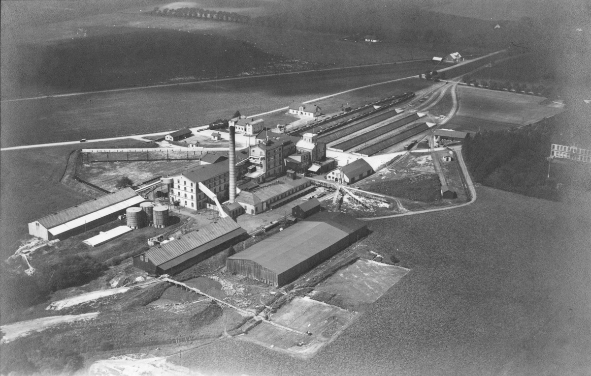 Flygfotografi över Råsockerfabriken i Jordberga.