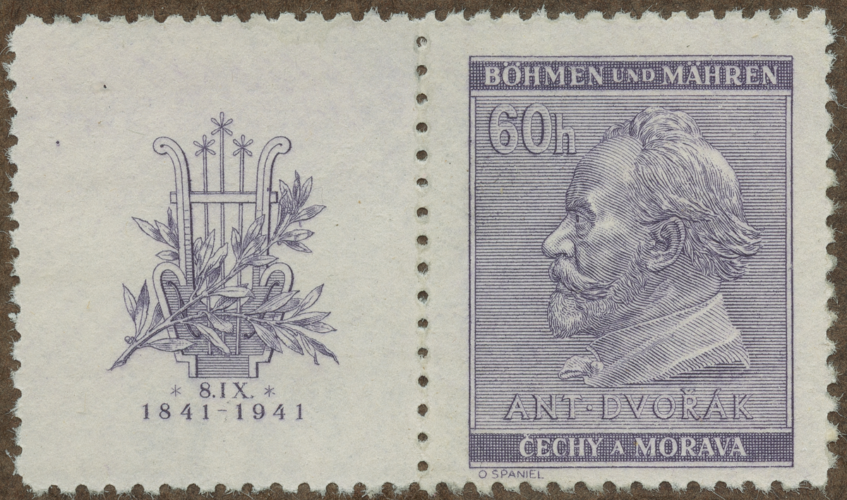 Frimärke från Böhmen-Mähren, 1941. Motiv av Antonin Dvorak: 1841-1904. Kompositör -100-årsminne av hans födelse: 1841-1941-