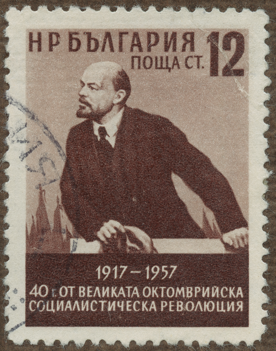 Frimärke från Bulgarien, 1957. Motiv av Lenin i talarstolen 40-årsminne av ryska Revolutionen: 1917-1957.