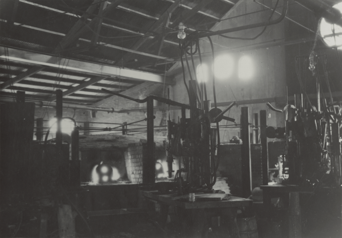 Glasbruk. Siemensugn med uppstättning av halvautomatiska maskiner. Ur album: Limmareds Glasbruk 1740-1902-1930.