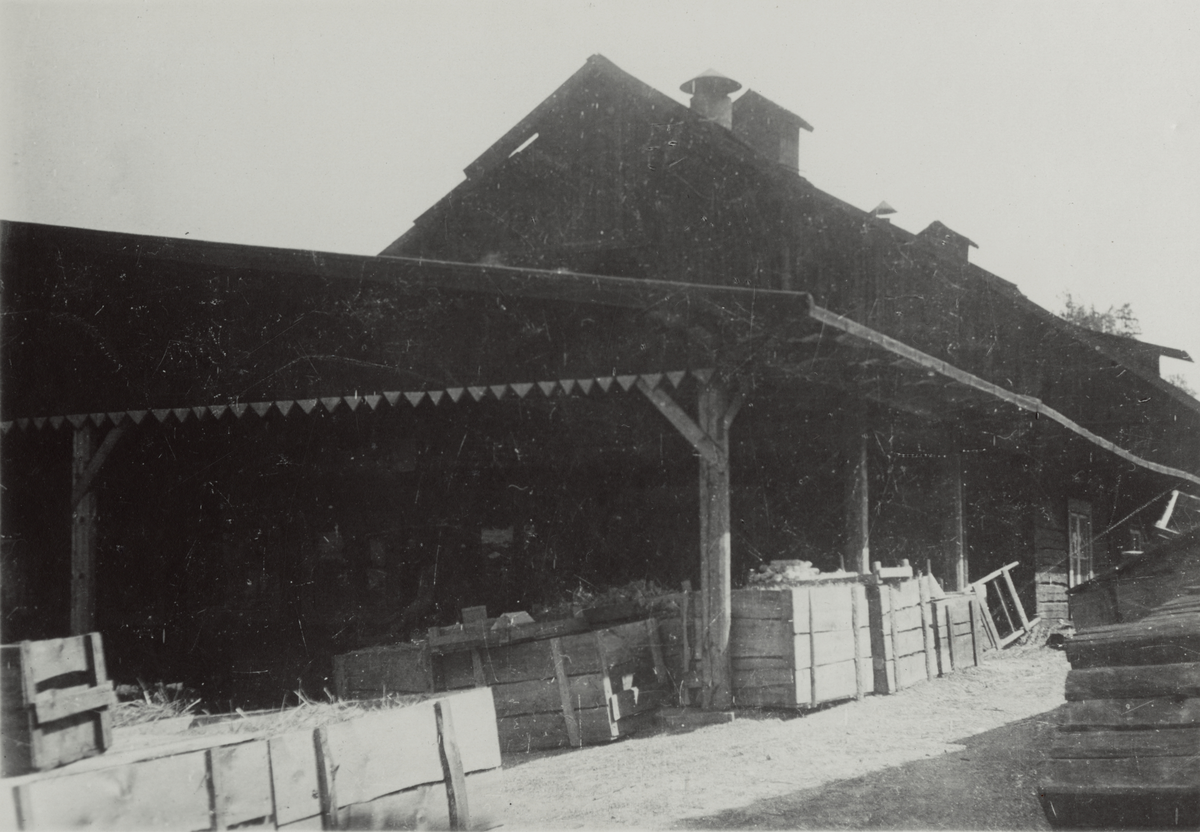 Limmareds Glasbruks gamla hytta med pockskjul. Ur album: Limmareds Glasbruk 1740-1902-1930.