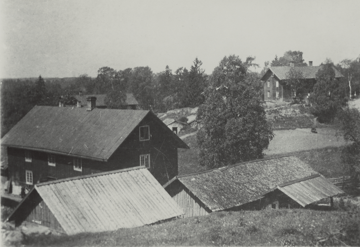 Vy över degelkammaren och äldre arbetarbostad "Fatiralla". Ur album: Limmareds Glasbruk 1740-1902-1930.