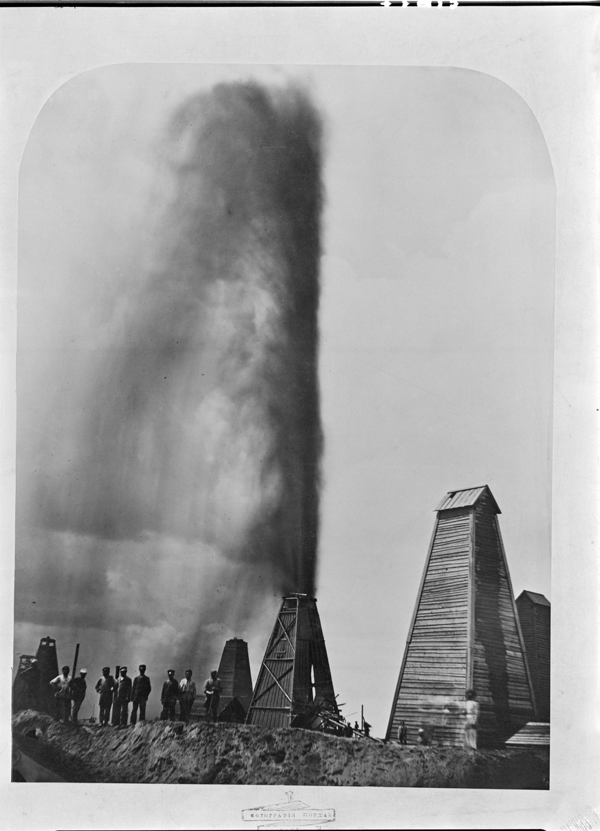 Bild från oljefälten i Baku. Män vid sprutande oljeborrtorn.