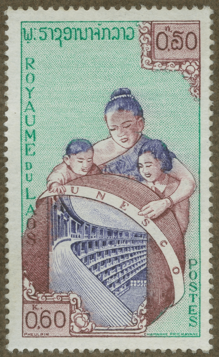 Frimärke från Laos, 1958. Motiv av jordglob, Unescobyggnad. "Unesco-band".