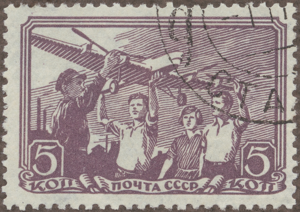 Frimärke från Ryssland, 1938. Motiv av Ryska barn med stor flygplansmodell