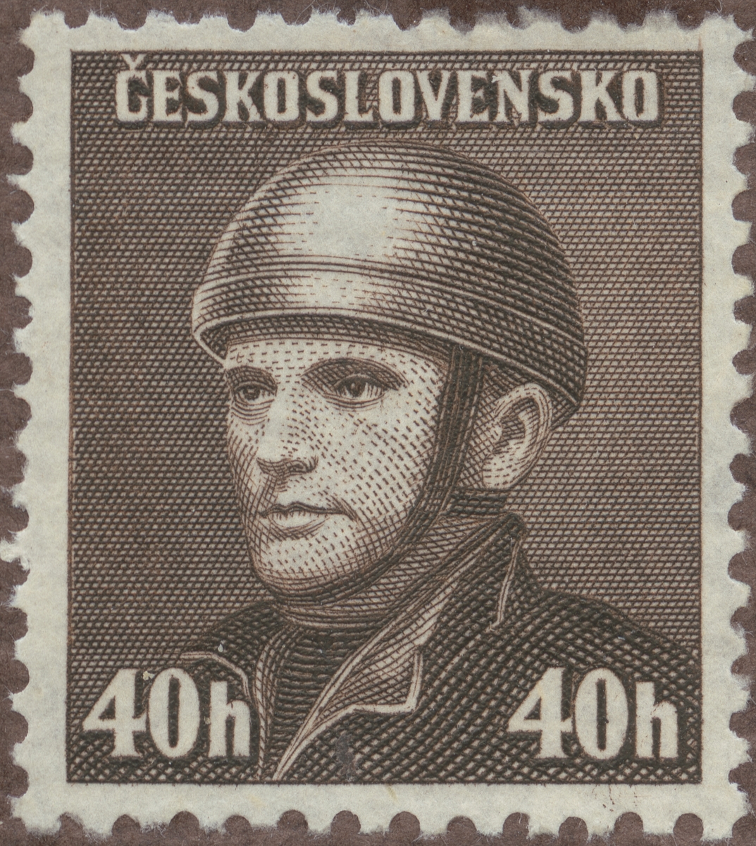 Frimärke från Tsceckoslovakiet, 1945. Motiv av Fäktlärare Joseph Gabak Tscheckoslovakisk flygare