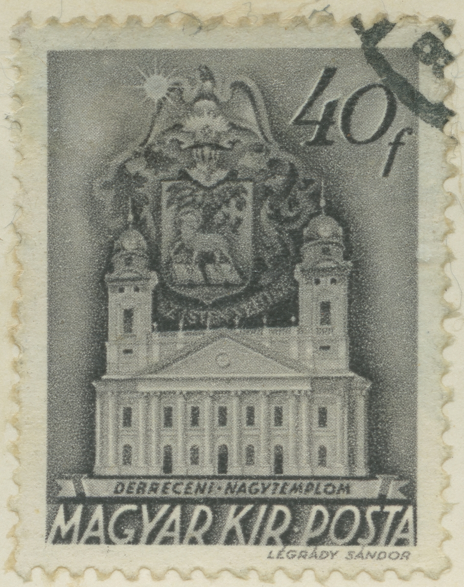 Frimärke från Ungern, 1939. Motiv av Reformertakyrkan i Debrecen.