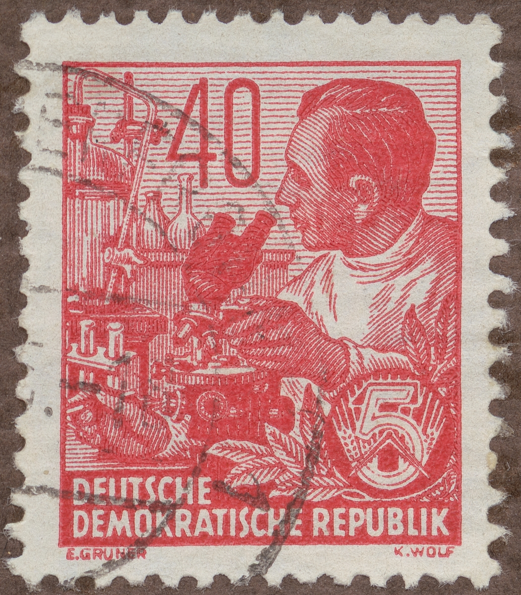 Frimärke från Östtyskland, 1953. Motiv av kemist i laboratorium. "Serie: Östtysklands 5-årsplan".