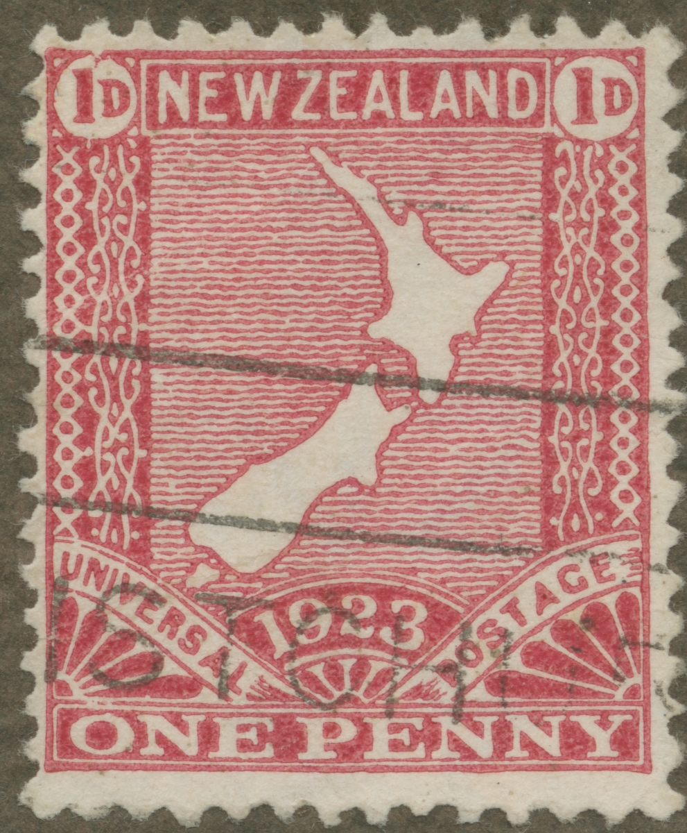Frimärke från Nya Zeeland, 1923. Motiv av karta över Nya Zeeland. "Minne om återupptagandet av "penny" frankering".