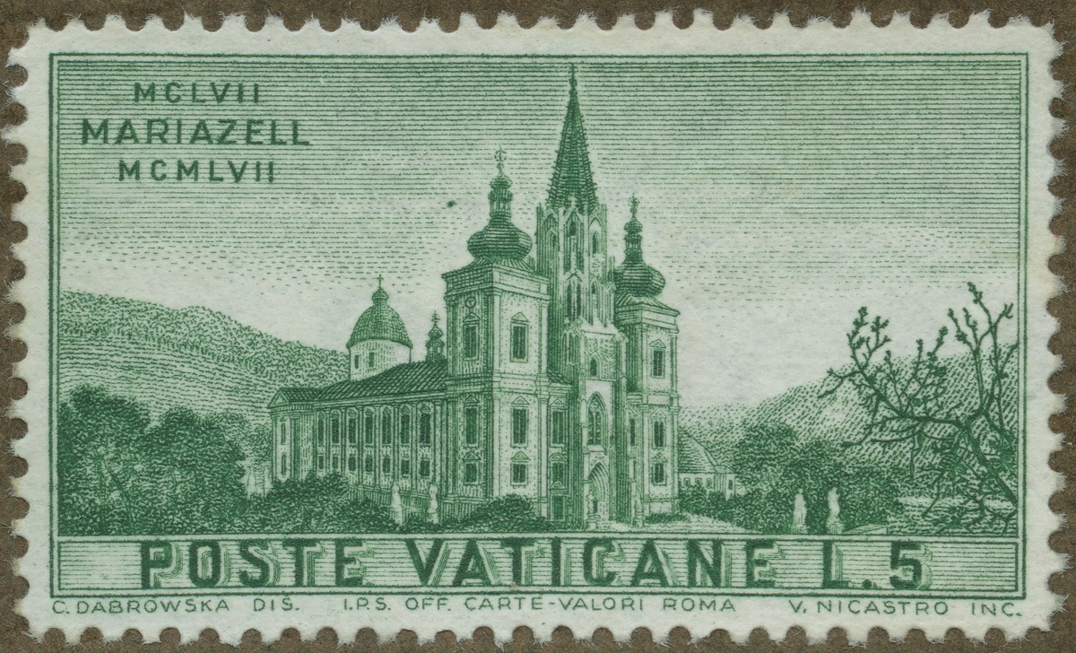 Frimärke från Vatikanen, 1957. Motiv av katedralen Mariazell, Österrike. "800-årsminne av Maraizellhelgedomen: 1157-1957".