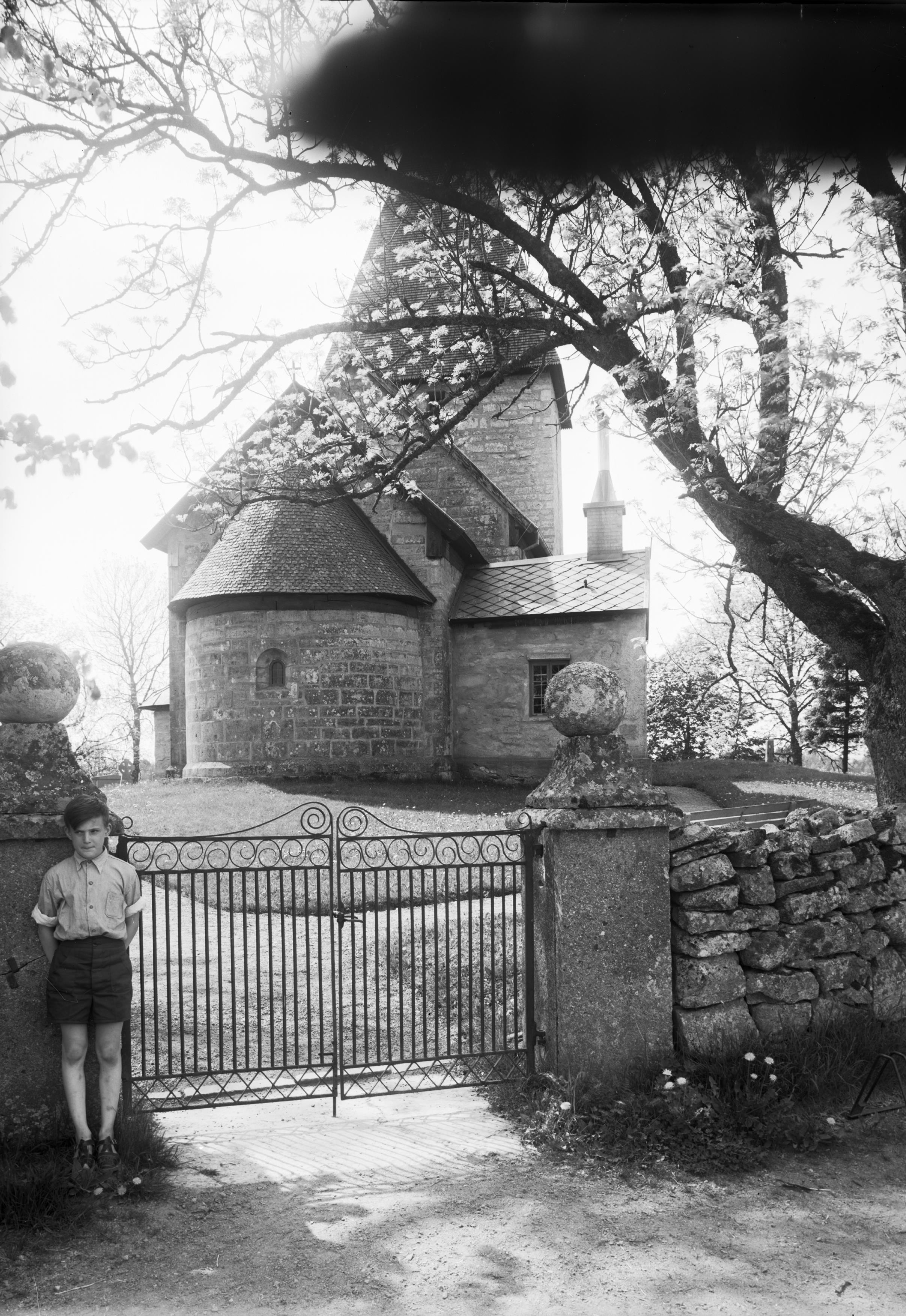 Kyrkan från öster, med kyrkogrinden i förgrunden.