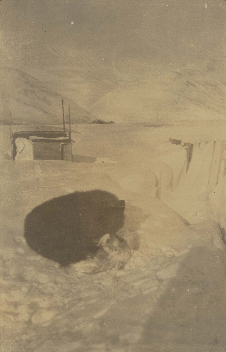 Fotografi från expedition till Spetsbergen. Motiv av hund som vilar sig mitt i ett snölandskap.