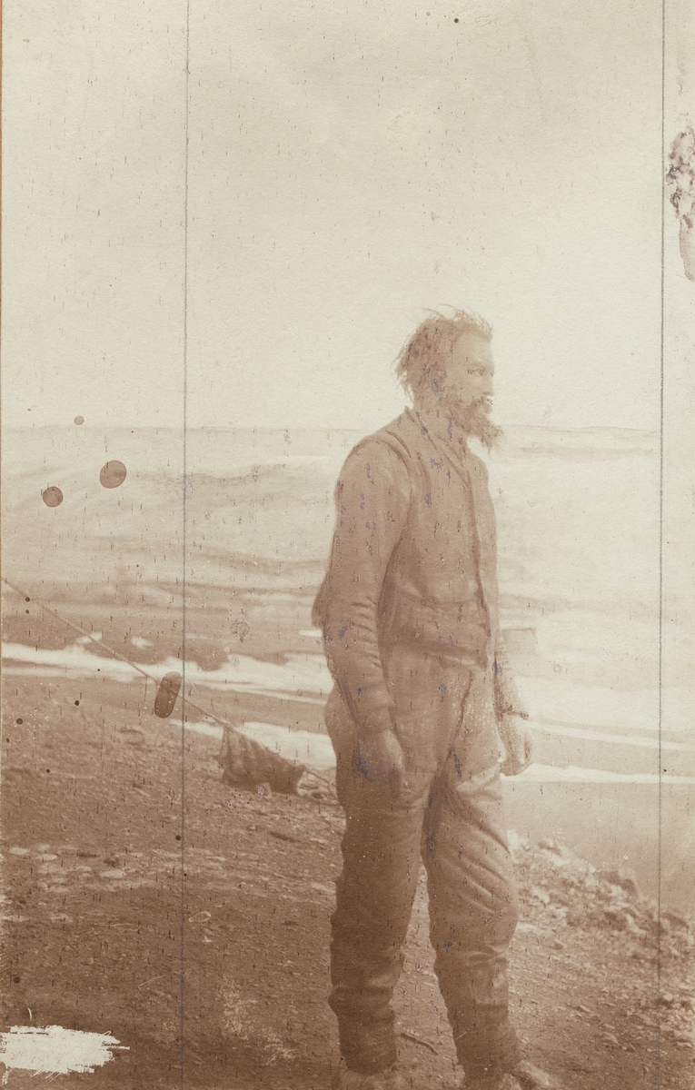 Fotografi från första svenska Antarktisexpeditionen 1901-1904. Motiv av skäggig man stående i ett bergslandskap. Troligtvis är det Toralf Grunden.