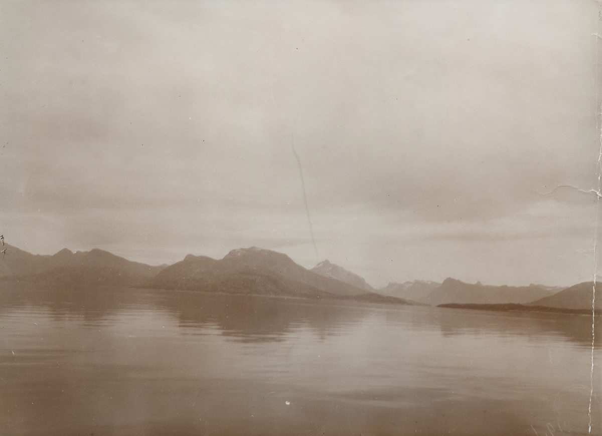 Fotografi från expedition till Grönland. Vy över hav, berg och molnig himmel.