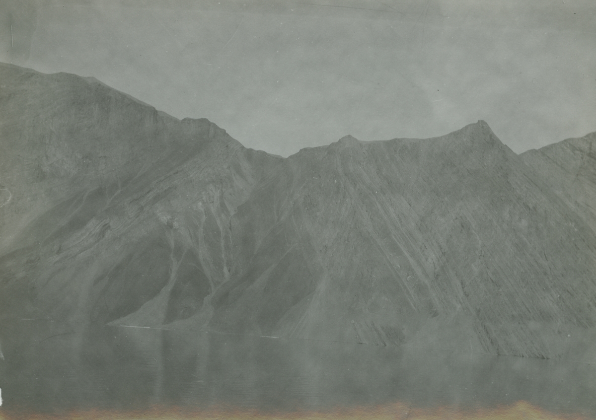 Fotografi från expedition till Östgrönland 1929. Dansk-svensk expedition under ledning av Lauge Koch. Svenska deltagare: Oscar Kulling och Helge Backlund. Motiv av vatten, berg och himmel.