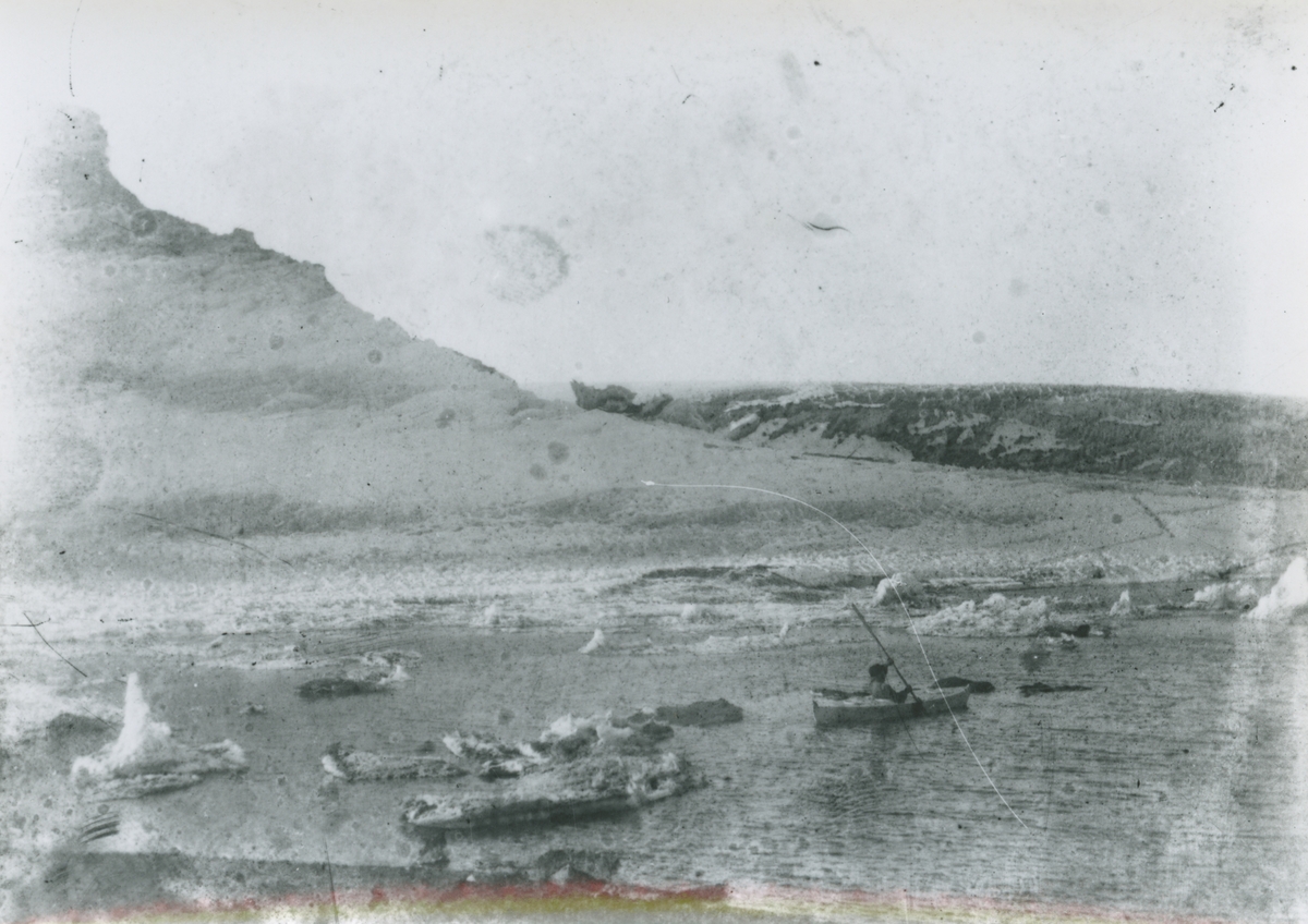 Fotografi från expedition till Grönland. Motiv av person som paddlar i kajak nära strand.