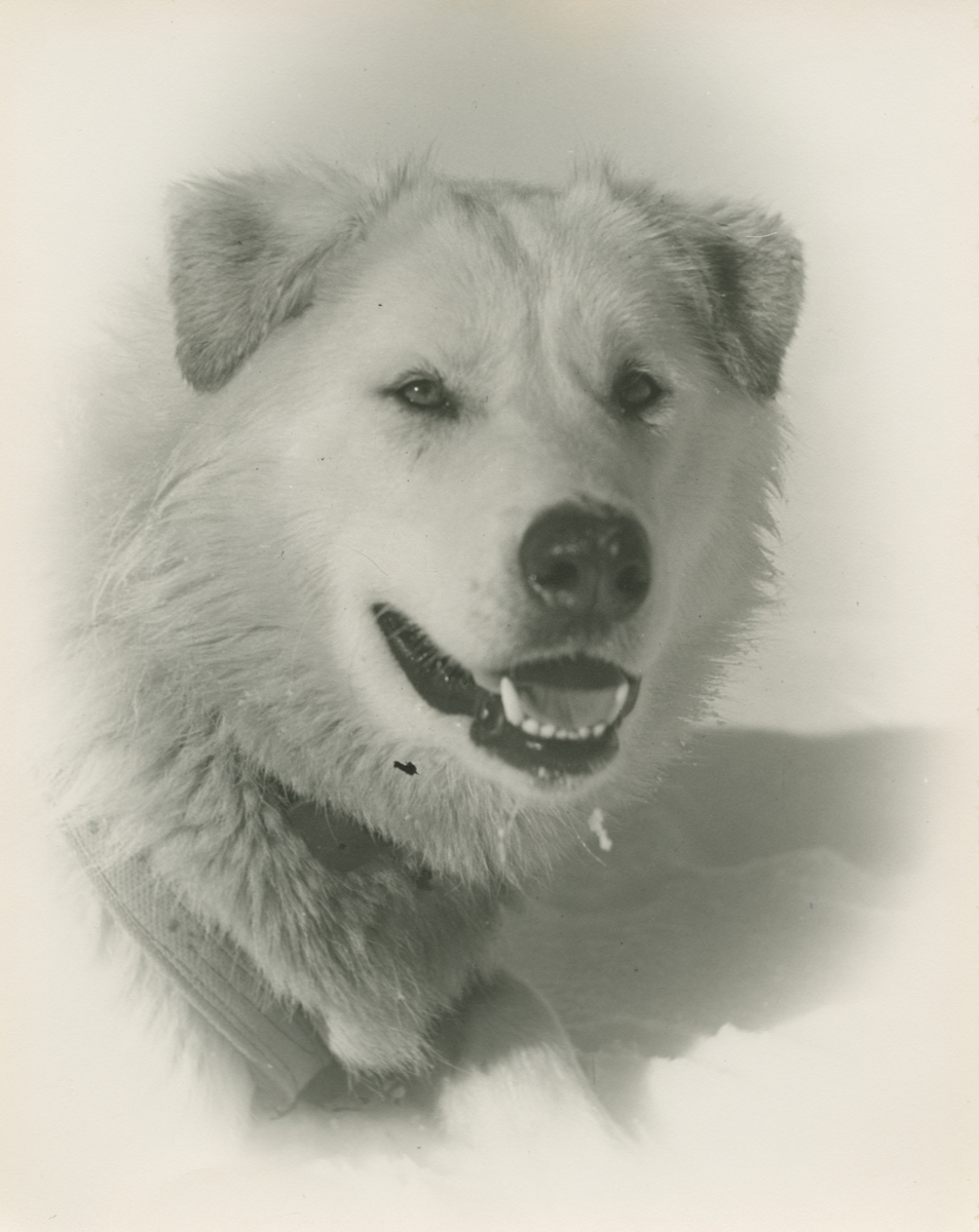 Fotografi från låda märkt Bernt Balchen. Balchen var norsk-amerikansk flygare, polarforskare och militär. Porträttbild av polarhunden Rinsky.