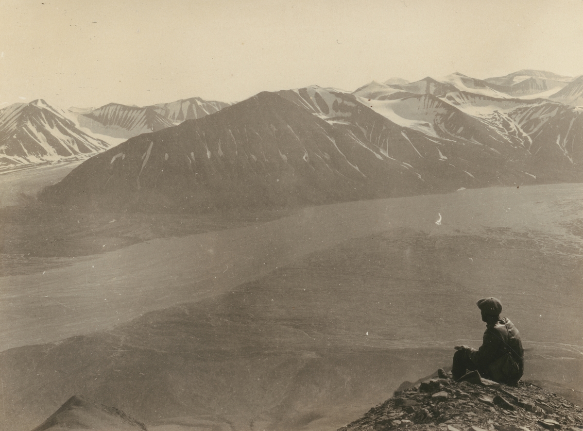 Fotografi från expedition till Sveagruvan. Motiv av man som sitter och blickar ut över istäckt bergslandskap.