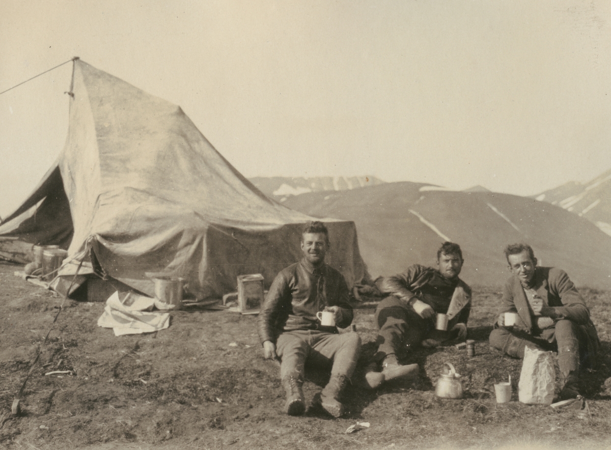 Fotografi från expedition till Sveagruvan. Motiv av tre expeditionsdeltagare som sitter utanför ett tält.