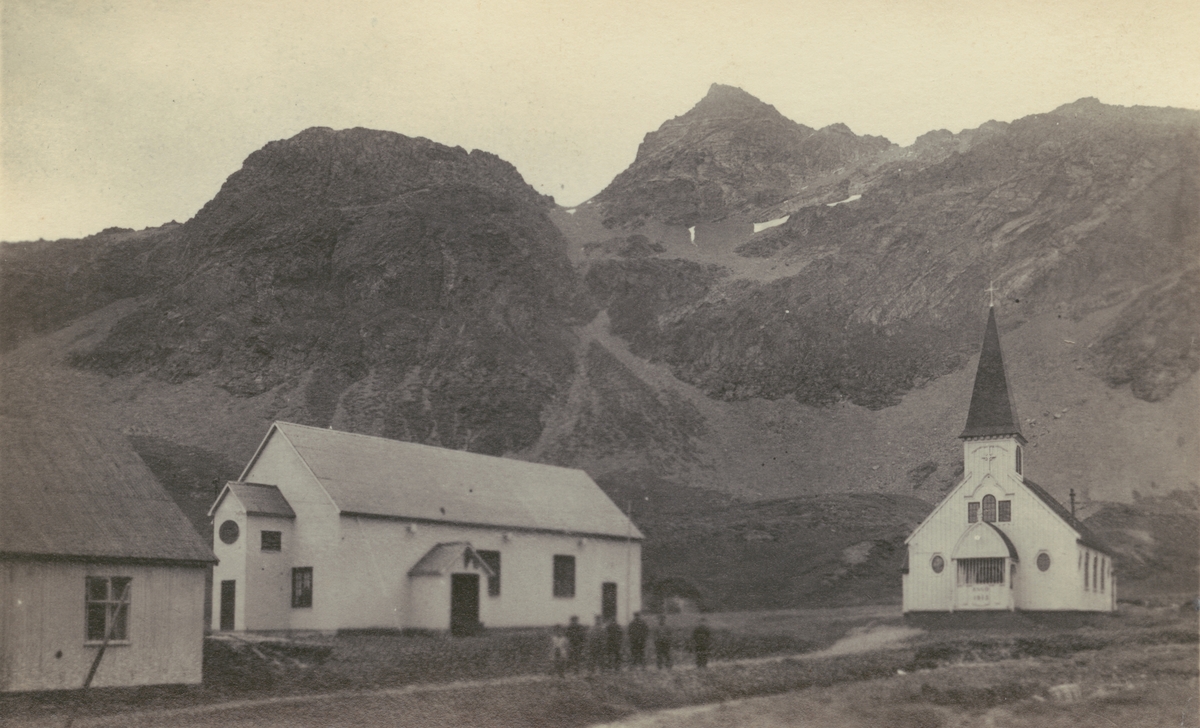 Bild från expedition i Antarktisområdet. Motiv av kyrka och biograf nedanför berg.
