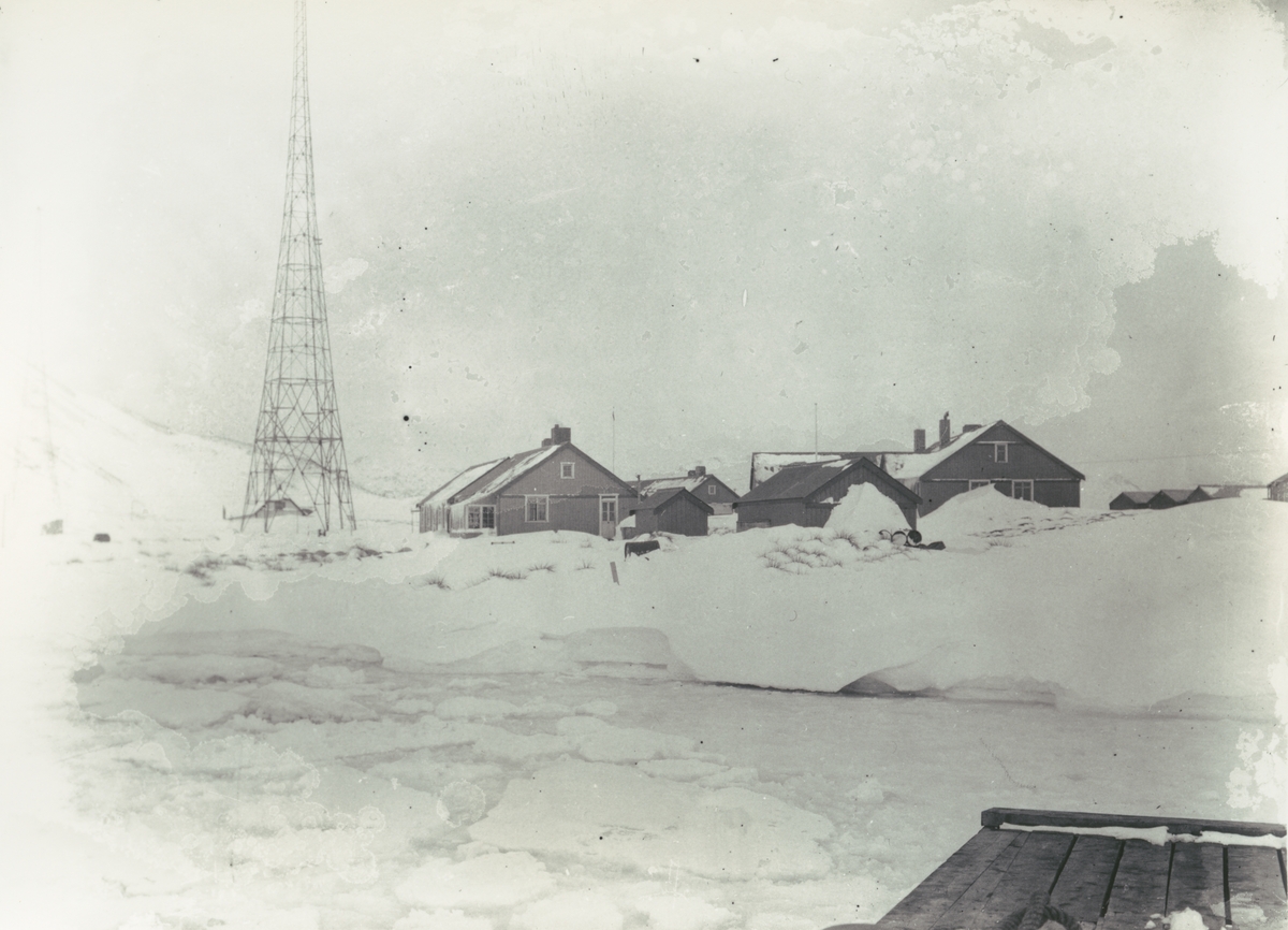 Bild från expedition i Antarktisområdet. Motiv av hus och snö vid King Edwards udde.