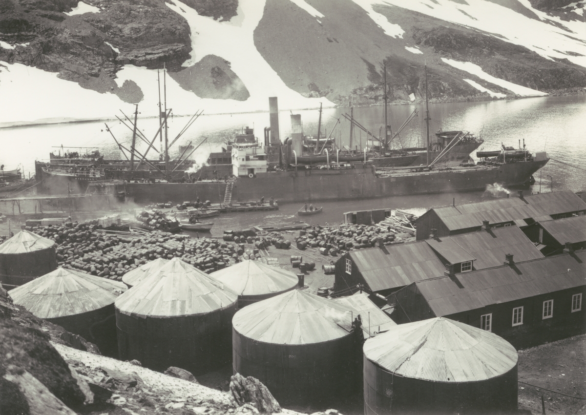 Bild från expedition i Antarktisområdet. Motiv av båt och hus i Leith Harbour, 1912.