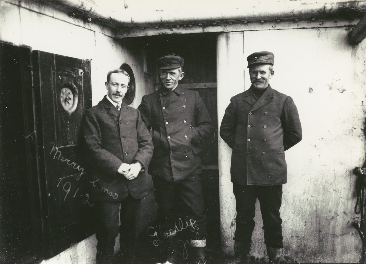 Bild från expedition i Antarktisområdet. Motiv av tre män ombord på fartyg.