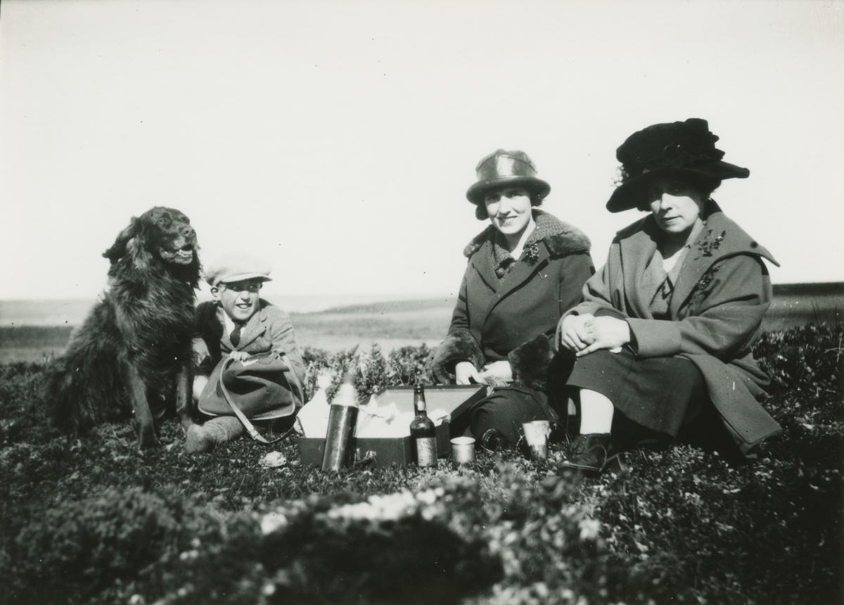 Bild från expedition i Antarktisområdet. Motiv av två kvinnor, en pojke och en hund som har picnic.